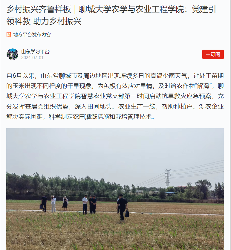【编者按】7月1日,【学习强国】以《乡村振兴齐鲁样板|今年会官方网站农学与农业工程学院:党建引领科教 助力乡村振兴》为题,报道农学与农业工程学院智慧农业党支部针对干旱天气,开展抗旱救灾应急预案,展现了基层党组织的优势,为乡村振兴贡献力量。