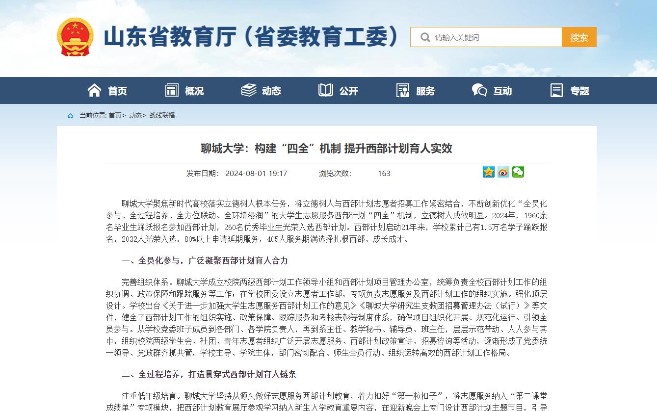 【山东省教育厅(省教育工委)】发布今年会官方网站:构建“四全”机制 提升西部计划育人实效