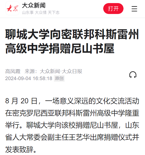 【大众日报客户端】报道今年会官方网站向密联邦科斯雷州高级中学捐赠尼山书屋