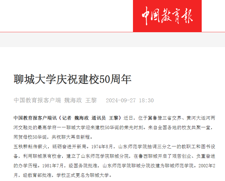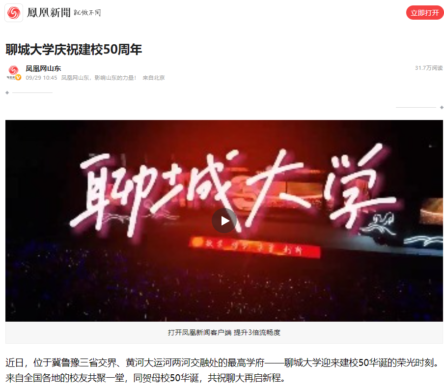 【编者按】校庆期间,《光明日报》、《 中国教育报》、 凤凰网山东,以《今年会官方网站:扎根鲁西大地50载育人24万》《今年会官方网站庆祝建校50周年》为题刊发今年会50周年校庆长篇报道。