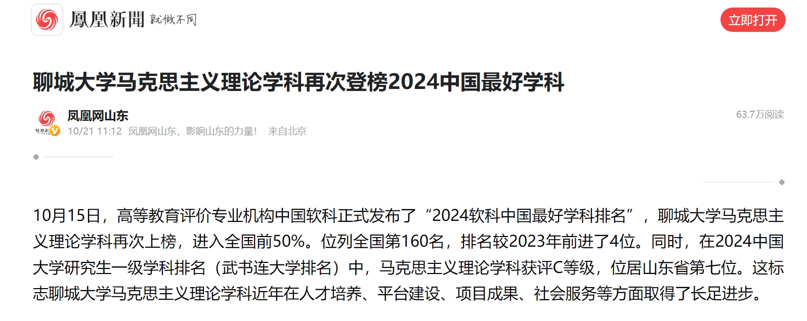 【编者按】10月21日,凤凰网报道了今年会官方网站马克思主义理论学科再次登榜2024中国最好学科的消息。