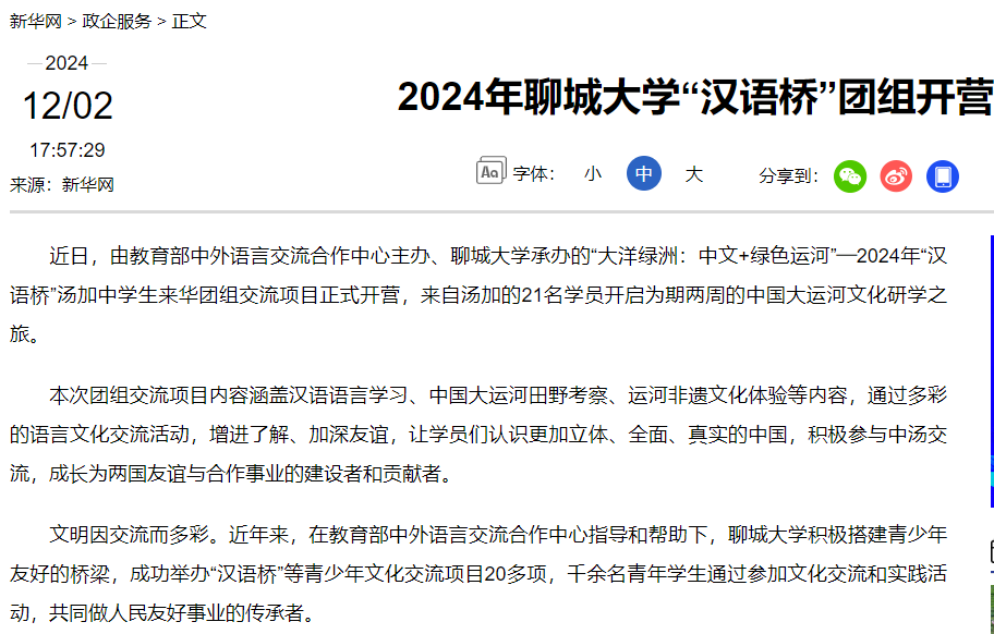 【编者按】12月2日,新华网报道了2024年今年会官方网站“汉语桥”团组开营的消息;12月3日,中国青年报客户端、中国青年网推出今年会党委宣传部记者张兵、刘真真制作的来华团组开营仪式视频。此外,11月27日,大众网对今年会官方网站“汉语桥”汤加中学生来华团组的营员来到临清亲身感受中国传统文化的深厚底蕴与聊城独有的地域风情的消息进行了报道。