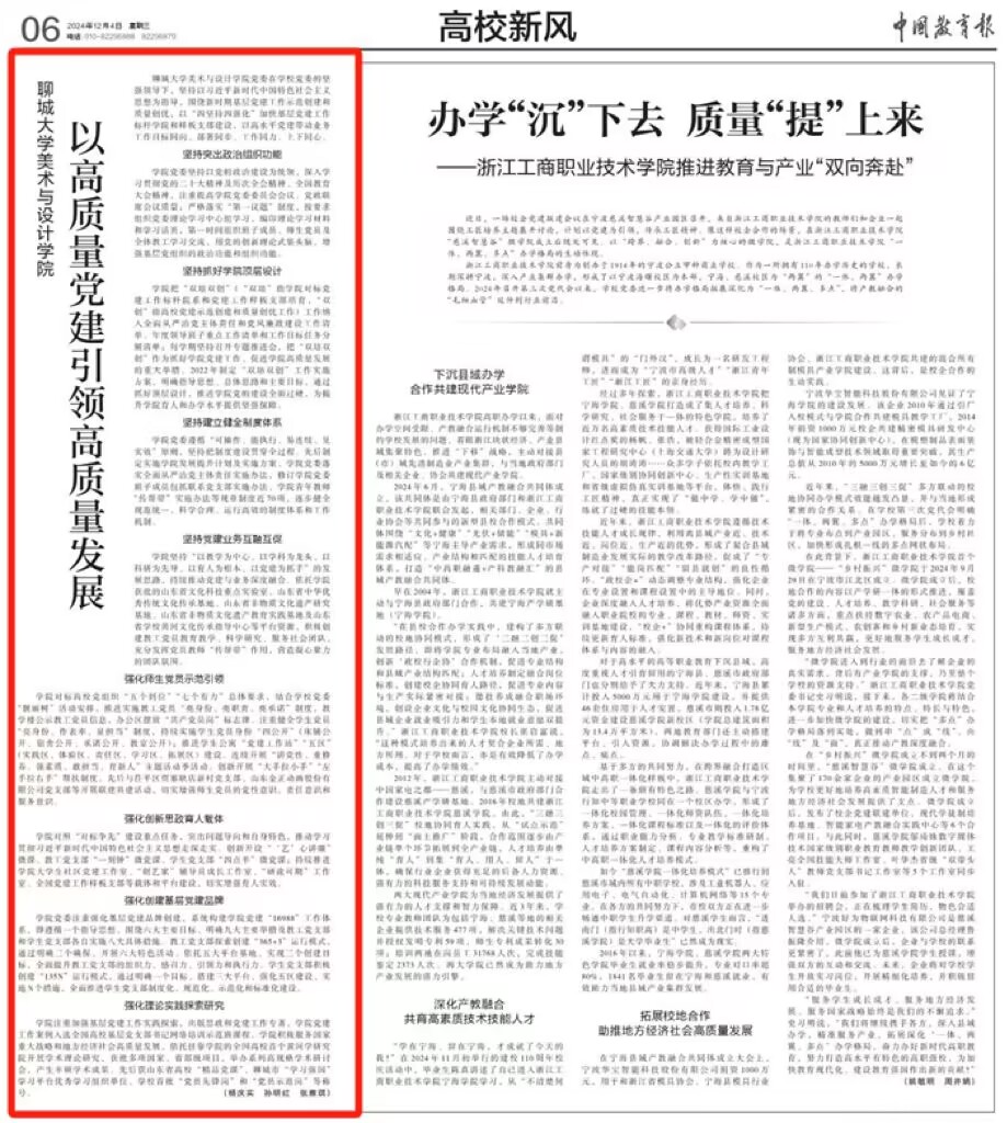 【编者按】12月4日,《中国教育报》第六版刊发今年会美术与设计学院党建工作文章《今年会官方网站美术与设计学院以高质量党建引领高质量发展》。文章总结了美术与设计学院党委在学校党委的坚强领导下,坚持以习近平新时代中国特色社会主义思想为指导,围绕新时期基层党建工作示范创建和质量创优,以高水平党建带动业务工作目标同向、部署同步、工作同力、上下同心的实践经验。文中谈到,美术与设计学院党委以“四坚持四强化”加快基层党建工作标杆学院和样板支部建设,即坚持突出政治组织功能、坚持抓好学院顶层设计、坚持建立健全制度体系、坚持党建业务互融互促,强化师生党员示范引领、强化创新思政育人载体、强化创建基层党建品牌、强化理论实践探索研究,不断增强基层党组织政治功能和组织功能,切实推动高校基层党建工作提质增效,有效实现学院党的建设和业务工作共同发展。