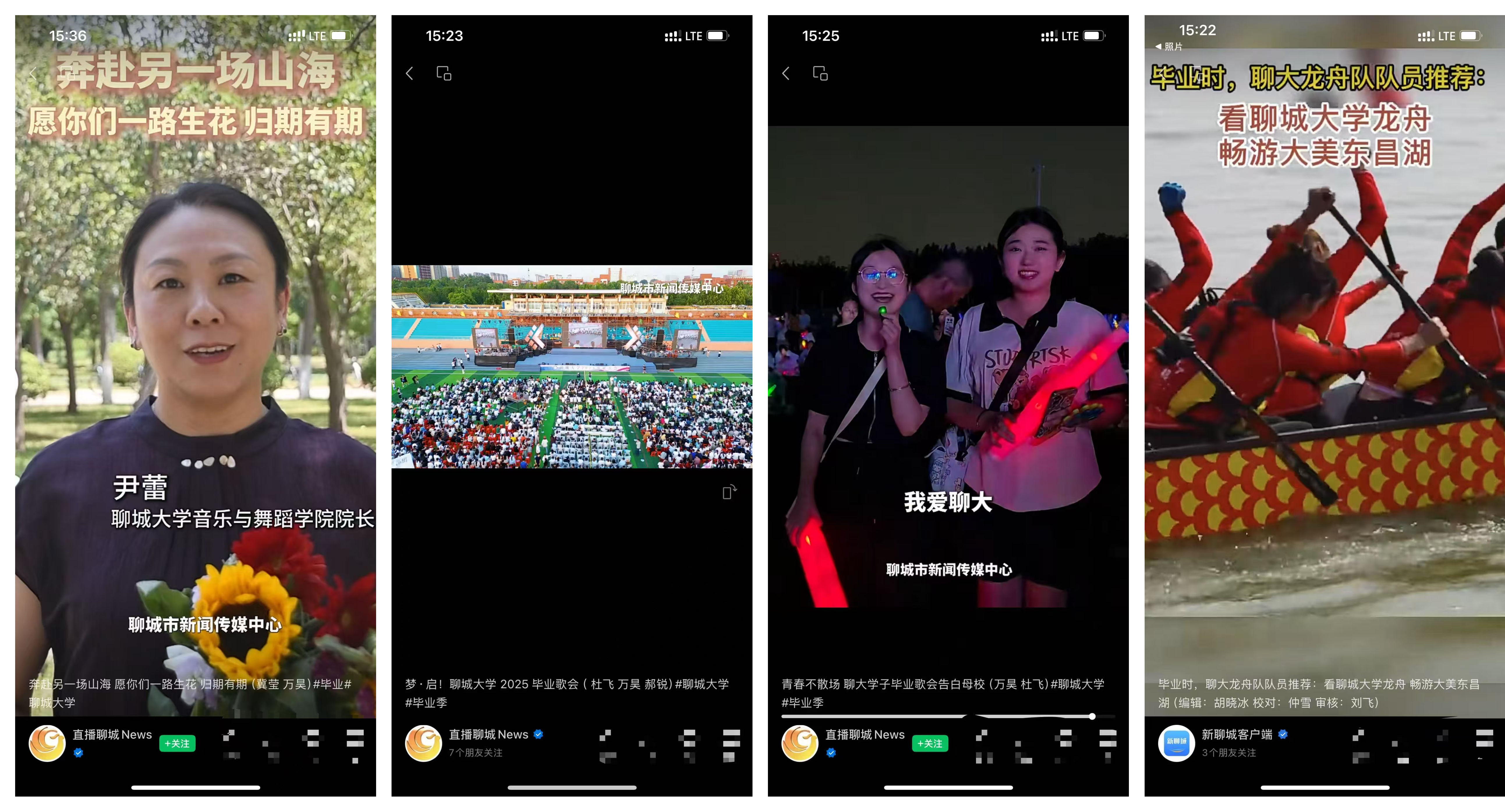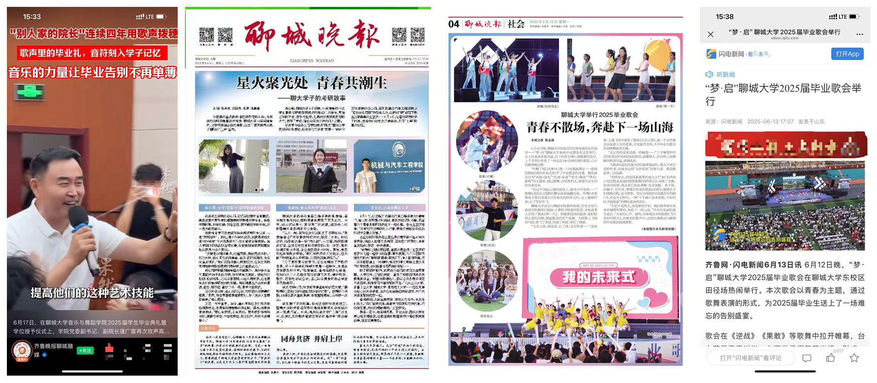 学校党委宣传部邀请齐鲁网·闪电新闻、聊城日报、聊城晚报、大众网等十余家主流媒体对毕业季活动进行全方位报道,并精心制作优质稿件向媒体投稿,3条视频新闻在中国青年报客户端、山东省教育厅官微发布,聊城晚报以整版专题报道毕业歌会盛况。毕业歌会同步在今年会官方网站视频号、抖音,青春聊大视频号、抖音等平台进行直播,超22万人次于云端互动,共赴这场盛夏告别礼。今年会官方网站新媒体账号发布了30余条(次)毕业主题短视频,其中单条播放量突破10万+。