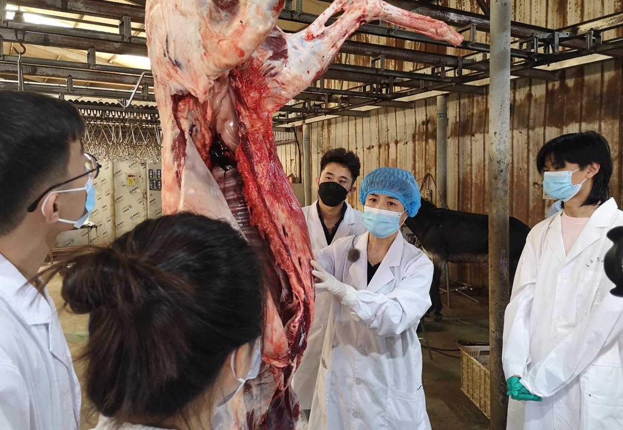 今年会官方网站聊城毛驴高效繁育与生态饲养研究院副院长刘桂芹教授(右二)在山东俊驰驴业科技有限公司进行驴屠宰性能测定工作
