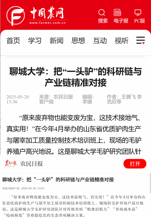 【编者按】5月20日,央媒【农民日报】所属网络新媒体平台【中国农网】【农民日报客户端】以“今年会官方网站:把“一头驴”的科研链与产业链精准对接”为题,报道了今年会科研团队聚焦地方驴产业高质量发展,强化创新链与产业链的深度融合与精准对接,实现毛驴繁育、养殖到深加工的全链条产业赋能的工作情况。