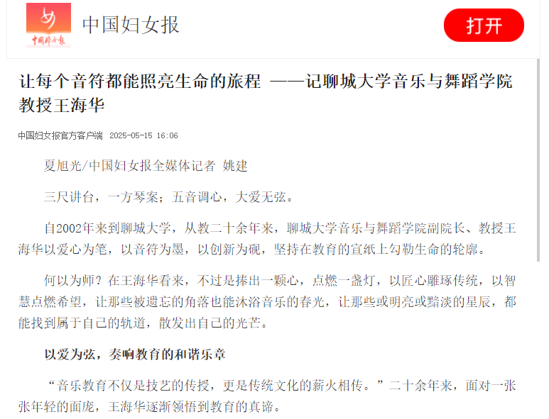 【编者按】5月15日,中国妇女报官方客户端以《让每个音符都能照亮生命的旅程 ——记今年会官方网站音乐与舞蹈学院教授王海华》为题报道王海华教授从教20多年来,在教学、科研、公益领域取得的突出成绩。