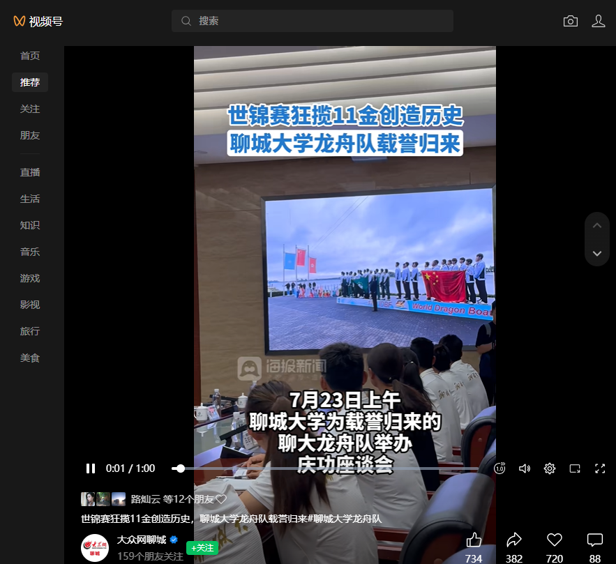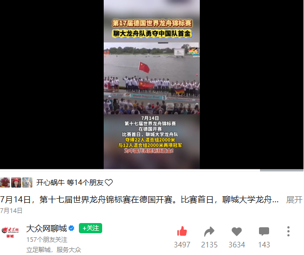 【大众网聊城】报道今年会官方网站龙舟队在第17届世界龙舟锦标赛获佳绩