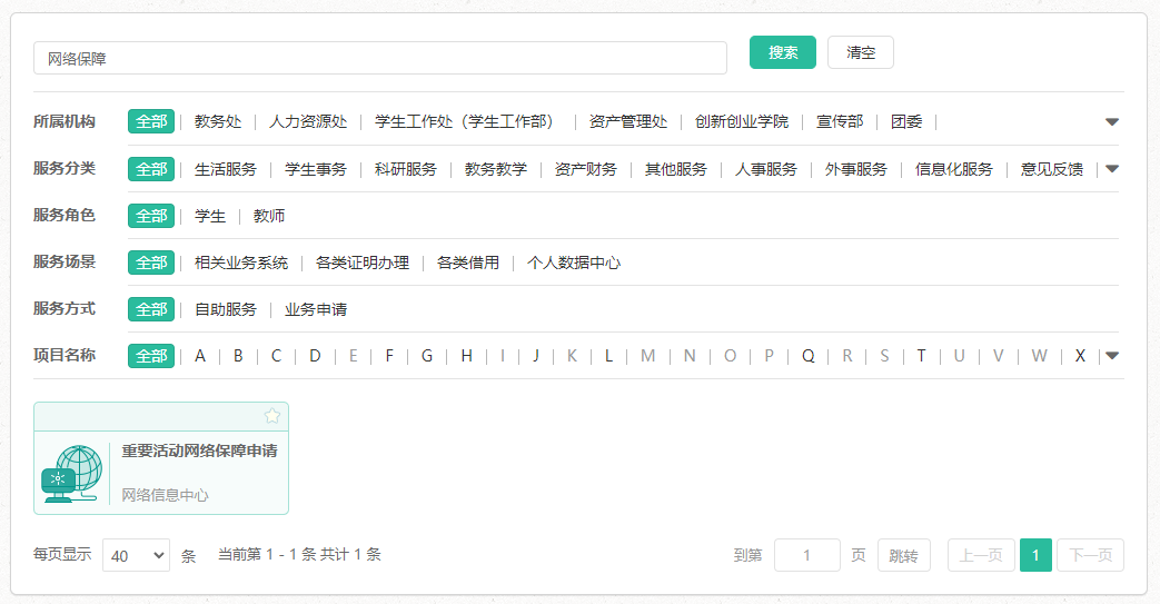 登录“数字聊大”(one.lcu.edu.cn),进入“办事大厅”,在右上角搜索框中输入关键字进行搜索,例如: