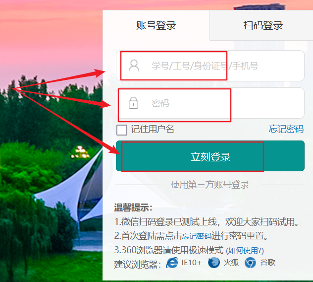2.进入数字聊大登录页面后,输入自己的账号(工号、身份证号或手机号)和密码,点击【立即登录】,即可进入系统。