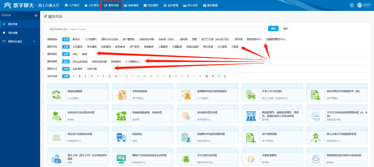 2.通过筛选类型,可根据所属机构、服务类型、服务角色等分类查看相关服务流程。