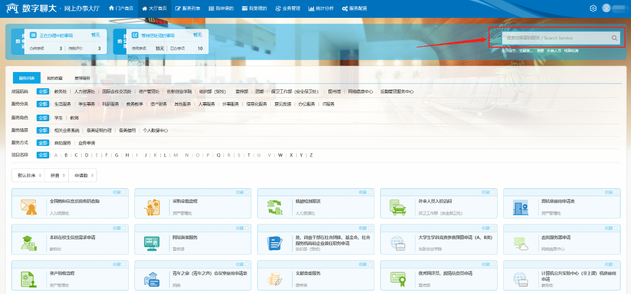 3.在【大厅首页】或【服务列表】页面中搜索服务名称,可快速查找到具体服务流程。