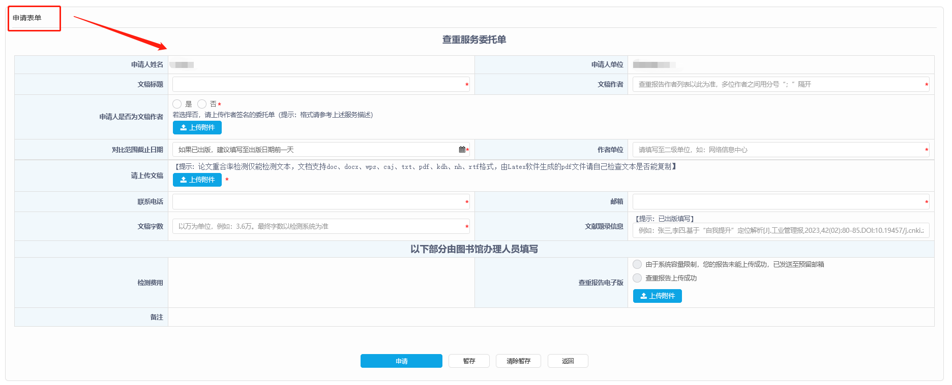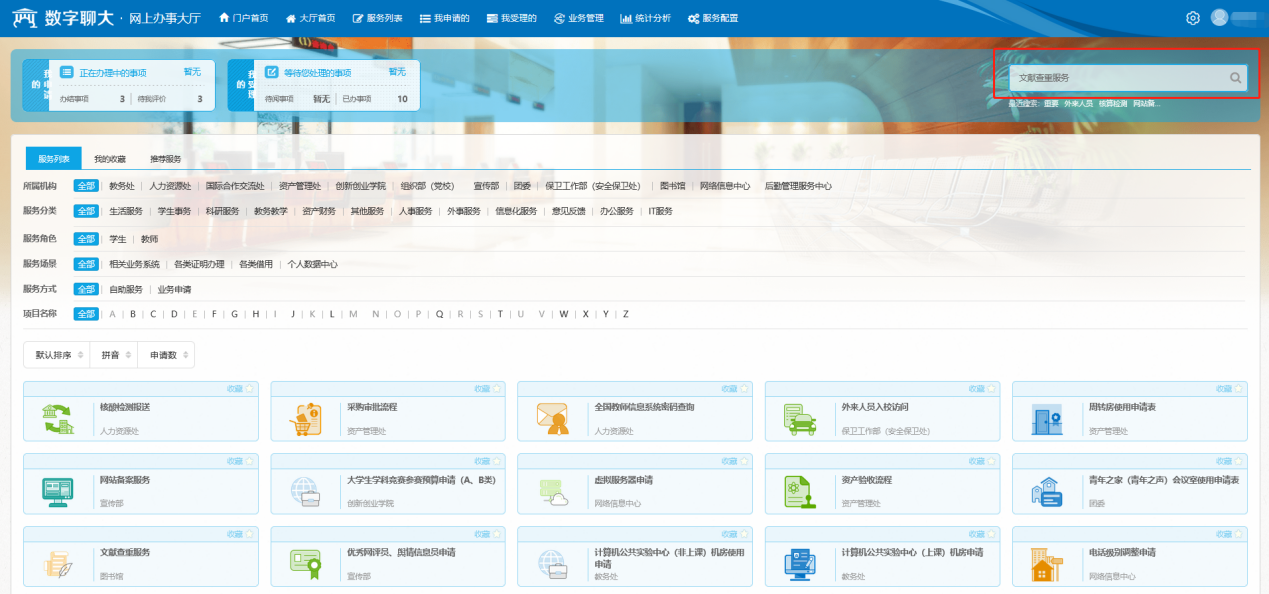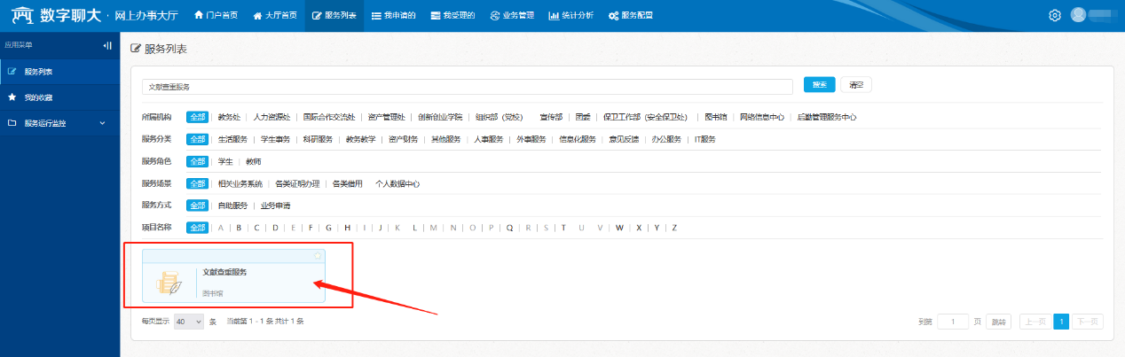 1.在此以【文献查重服务】举例,在办事大厅首页右上角搜索相关服务流程如下图: