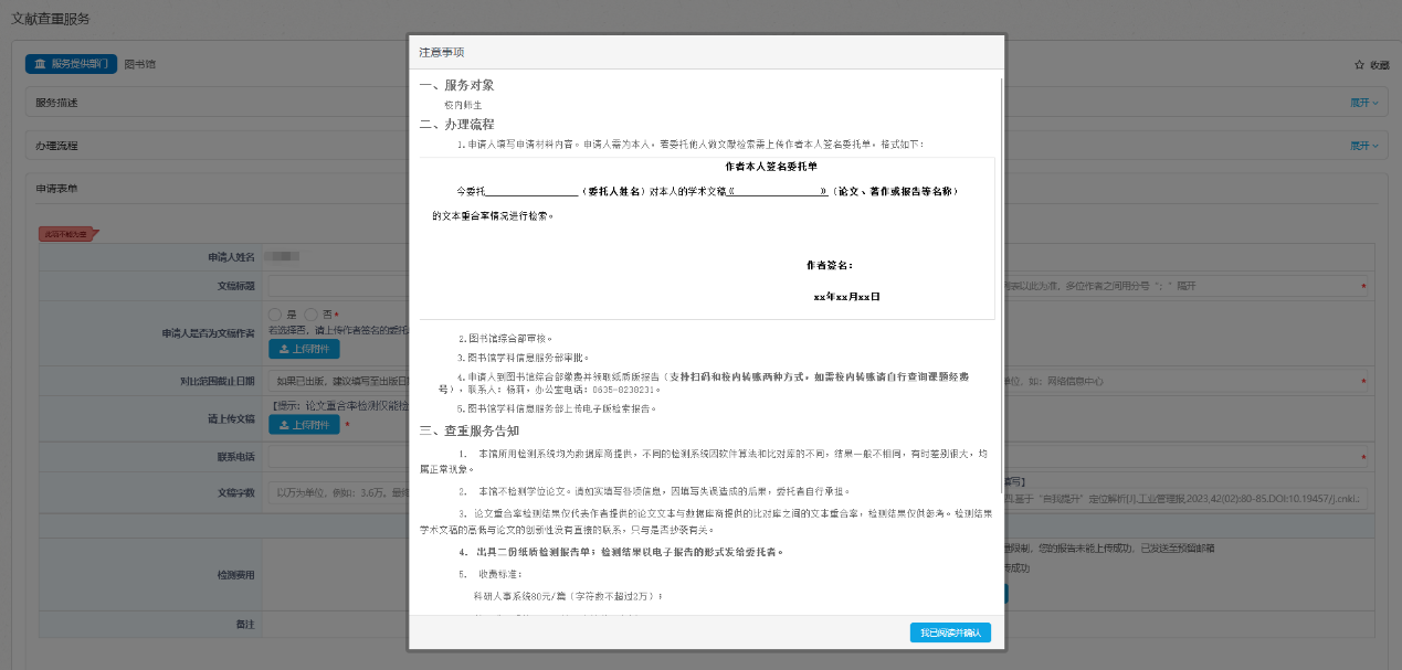 2.查询后得到搜索结果,点击【文献查重服务】图标进入,仔细阅读注意事项弹窗如下图,并点击确认。