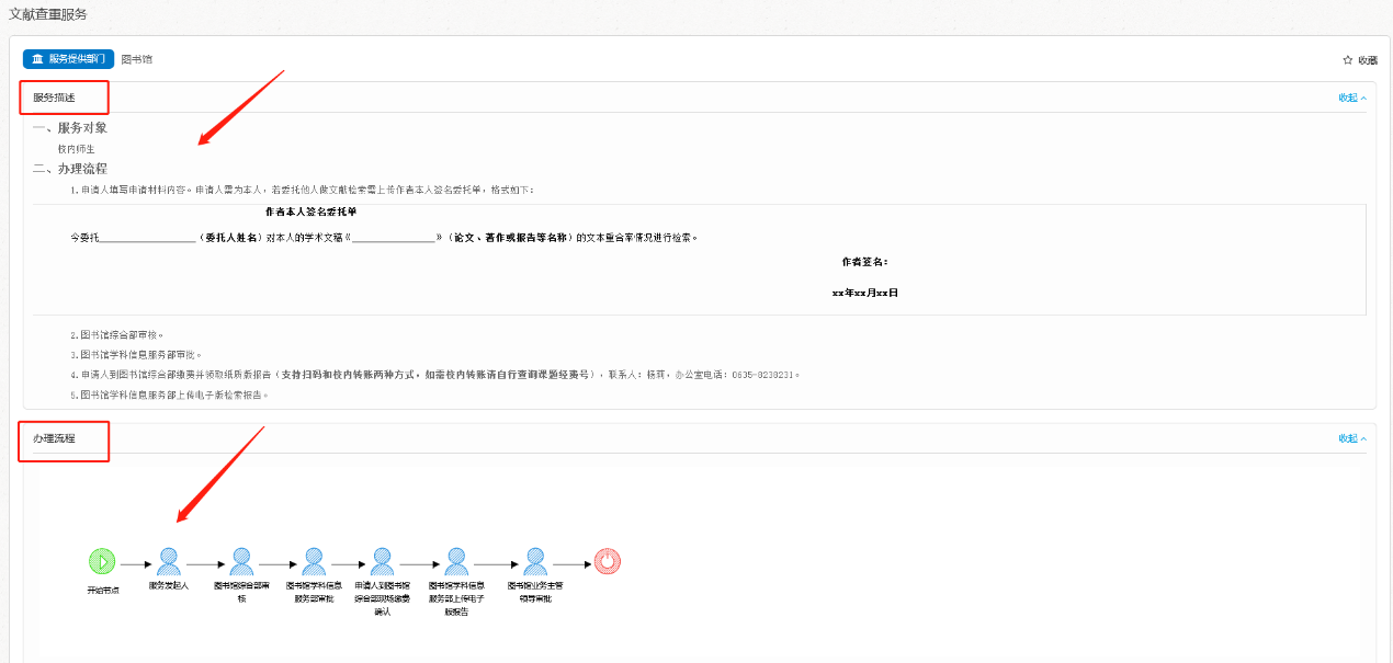 3.在【服务描述】、【办理流程】中可查看该服务的相关信息、流程审批节点,在【申请表单】中填写申请内容后点击申请,则该服务申请完成。