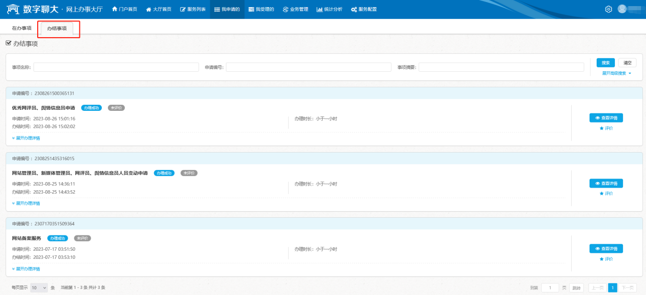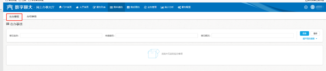 1.点击上方【我申请的】查看本人申请的业务流程,点击【在办事项】显示正在申请的业务流程,点击【办结事项】显示已办结的业务流程。