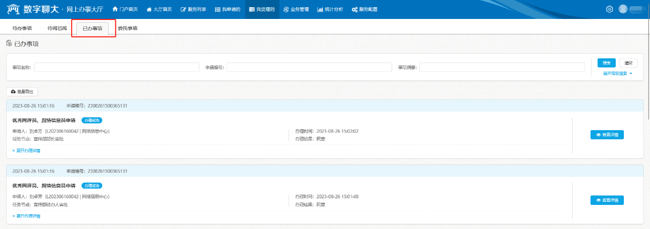 2.点击上方【我受理的】查看本人受理的业务流程,点击【待办事项】显示待本人办理的业务流程,点击【已办事项】显示本人已办理的业务流程。