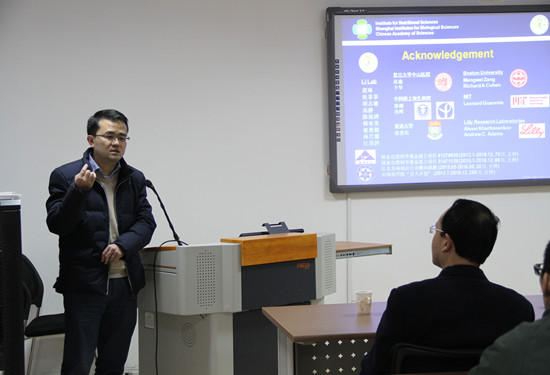 李于,博士,博士生导师,中国科学院上海生命科学研究院营养科学研究所研究员、研究组长。活动伊始,他介绍了脂肪肝和糖尿病等疾病的病理生理学机制,就该课题的研究方法及应用前景作了详细的阐述。紧接着,他介绍了利用肝脏特异性的SIRT1基因敲除小鼠发现SIRT1诱导肝脏激素FGF21的表达和分泌的研究内容,本研究表明激活SIRT1-FGF21通路可能为临床治疗脂肪肝和糖尿病提供了一种新思路。活动最后,李于教授就老师和同学们的提问作出了详细解答。