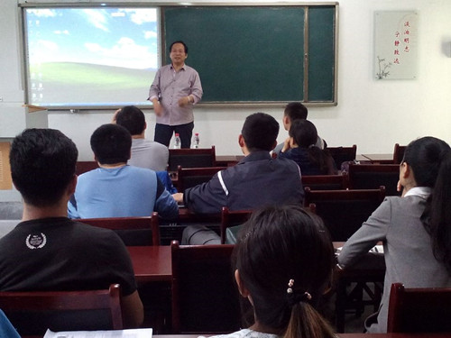 张维海教授详细地解说其研究方向,用通俗易懂的话语描述深奥晦涩的数学难题,其中,利用控制论的动态优化、随机微分方程、离散系统等理论研究皆引起观众的强烈共鸣。在讲义中,张维海引用哲理名言指出,“做学问,只求简单漂亮,把一些经典的结果回归到自己所研究的领域就好了”。最后,张教授就重难点问题与在场师生进行了深刻而愉快的交流。