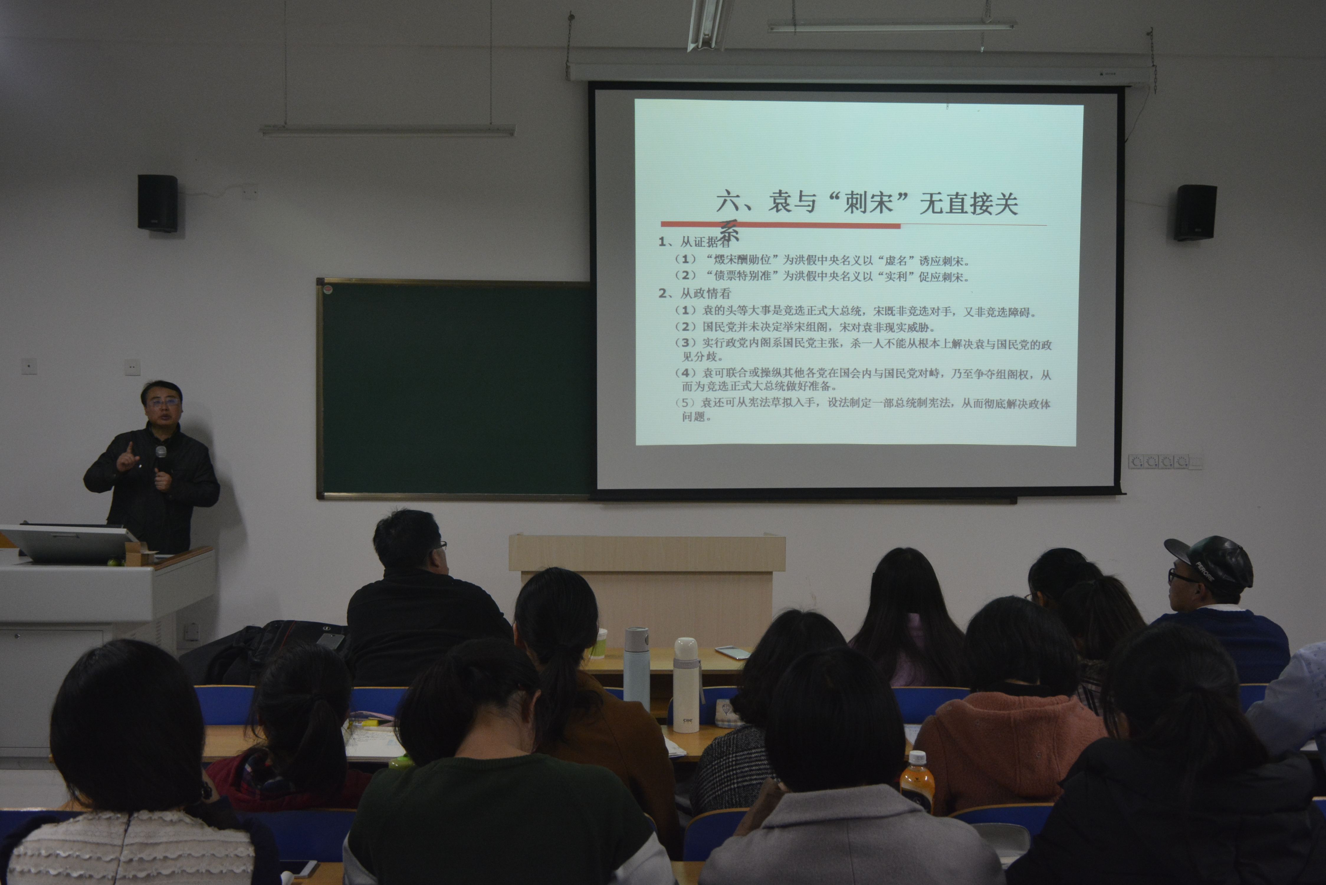 尚晓明教授从破解“刺宋案”的两原则一思路,即立足于原始证据考察案情、紧密结合 民初政情分析案情的原则和“宋案”不等同于“刺宋案”的思路入手,向师生们讲述并分析了“百年刺宋案”的幕后。尚小明教授首先带领师生了解了“刺宋案”基本案情及其大事记。在此基础上,从证据与政情两方面分析阐述了赵秉钧与“刺宋案”毫无关系、袁世凯与“刺宋案”无直接关系的观点及其原因,并证明了洪述祖才是“刺宋案”真正的主谋。对于案情的研究,尚小明教授提出,历史、现实、未来是一脉相承、有机联系的,纵使有些历史不能百分之百还原,但也要秉着尊疑、重据的原则去研究。