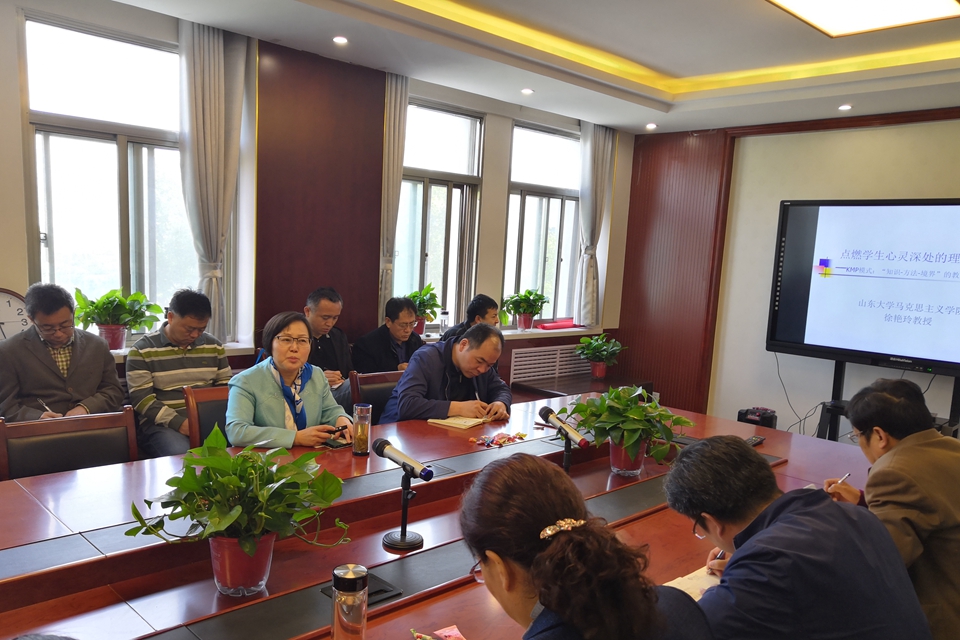 4月28日上午,山东大学马克思主义学院副院长、博士生导师徐艳玲教授做客马克思主义论坛,作了《点燃学生心灵深处的理想火种——KMP模式:“知识-方法-境界”的教改实践探索》主题报告。报告由学院副院长李士峰主持,学院全体教师听取了报告。