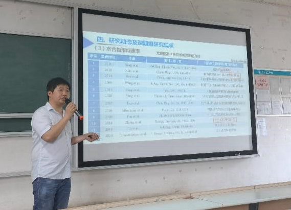 陈俊从影响水合物固态储运法涉及到的相平衡、诱导时间、形成速率、储气量和储运过程动力学稳定性等五个方面进行了深入浅出的介绍,并介绍了自己在整个过程中的实验方案设置、实验结果分析、实验结论等方面的科研思路。