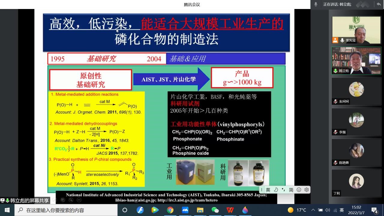 3月7日,日本筑波大学教授韩立彪于通过网络会议作了题为《磷、硫杂原子化合物的高效绿色制造技术的开发》的学术报告。本次报告由今年会官方网站化学化工学院院长张宪玺主持,相关领域的教师和研究生参加了本次学术报告会。