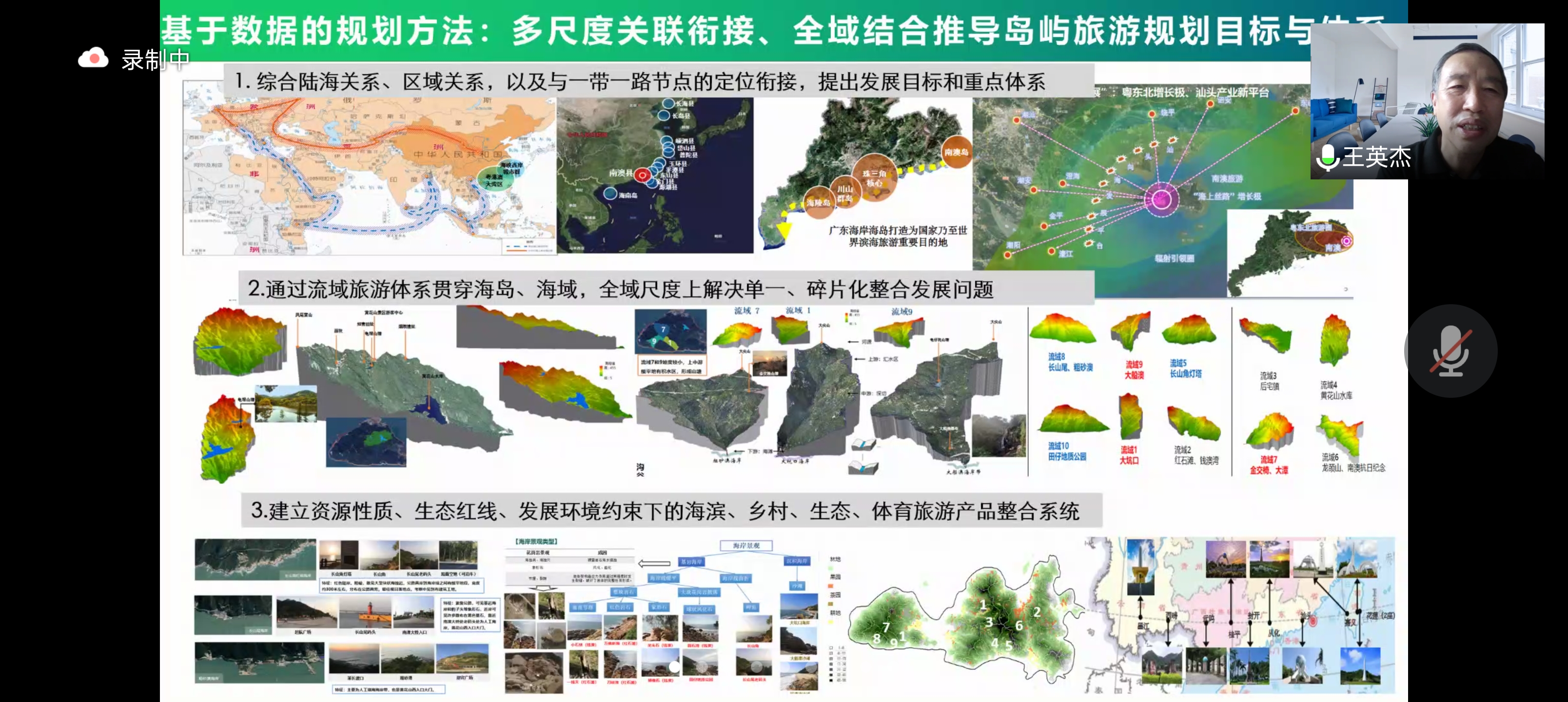 王英杰提出,通过中外海岛规划的对比来认识海岛规划的主要特点以及对南太平洋地区海岛规划的重要启示。他通过对加勒比海地区旅游战略规划、哥斯达黎加经济(旅游)特区规划、格林纳达国家战略规划与旅游规划、中巴、孟中印缅等10多个跨国空间(旅游)规划的实践案例,全面介绍了基于知识的大数据支持下的岛屿规划技术与方法。王英杰谈到三点认识。首先,基于大数据的规划方法可以实现多尺度关联衔接、全域结合推导岛屿旅游规划目标与体系,具体包括综合陆海关系、区域关系,以及与“一带一路”节点的定位衔接,提出发展目标和重点体系;通过流域旅游体系贯穿海岛、海域,全域尺度上解决单一、碎片化整合发展问题;建立资源性质、生态红线、发展环境约束下的海滨、乡村、生态、体育旅游产品整合系统。其次,基于知识的方法可以建立基于“资源—景观—图谱—设计”于一体的规划技术方法,具体包括基于网络大数据与自动获取的资源信息采集建库;基于三维地形空间分析与模型计量结合的图谱分析;促进计算机仿真与专家辅助决策的规划精度。第三,基于模型的规划方法可以通过定量分析辅助专家决策方法提升规划精度和科学性,具体包括基于GIS和遥感的最佳观景点分析与选点设计;基于水文模型分析的流域旅游开发利用空间比对与识别;基于多类型土地利用现状的开发利用潜力与约束性评价;基于资源信息数据库的旅游资源等级、质量和集聚区分析。