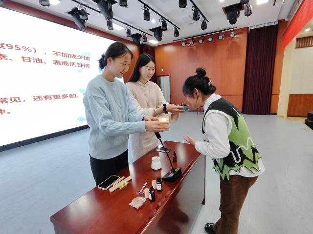 风景园林专业的研究生应邀作为嘉宾来到现场,为大家演示香水的挑选方法和艾灸条的使用。农学与农业工程学院特地为参会的同学们准备了暖心的艾草香包,为同学们送去健康的祝福,同时传播了中华传统文化。