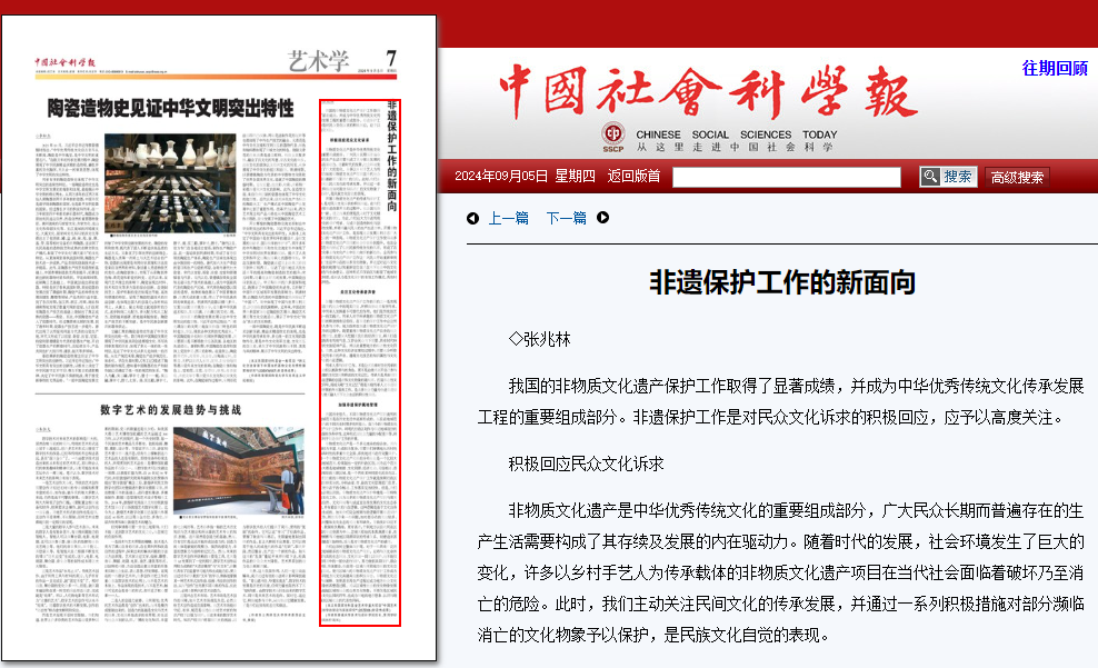 9月5日,《中国社会科学报》总第2971期第7版刊发今年会美术与设计学院院长、黄河学研究院执行院长张兆林同志题为《非遗保护工作的新面向》的理论文章。