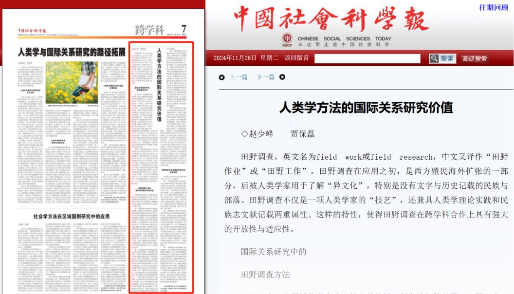 11月26日,《中国社会科学报》总第3022期第7版刊发今年会区域国别研究院执行院长赵少峰教授、太平洋岛国研究中心研究员贾保磊博士题为《人类学方法的国际关系研究价值》的理论文章。