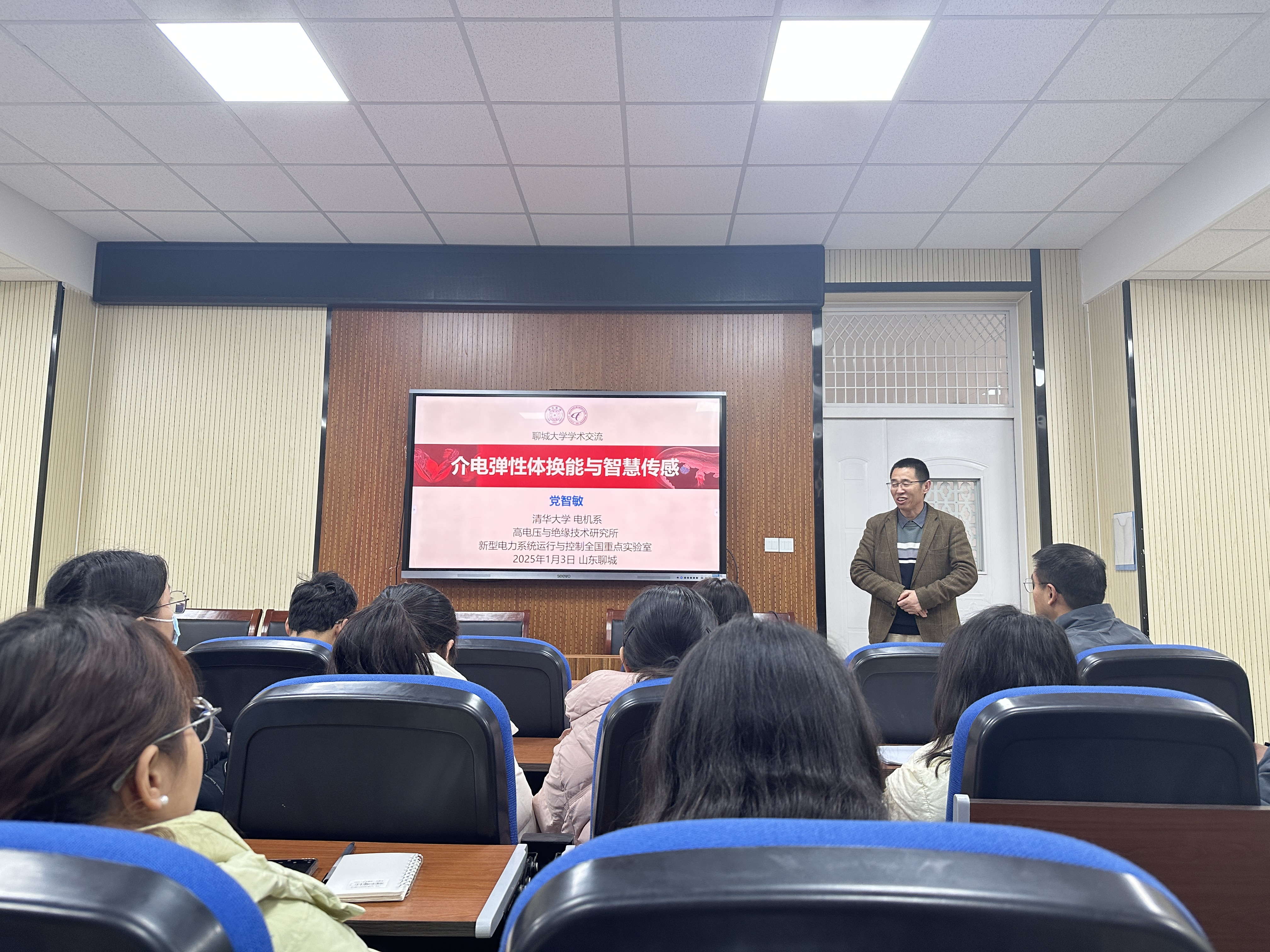 1月3日,清华大学电机系长聘教授党智敏应邀做客聊大讲坛,作了题为“介电弹性体换能与智慧传感”的学术报告。材料科学与工程学院相关教师、研究生及本科生参加了本次活动。