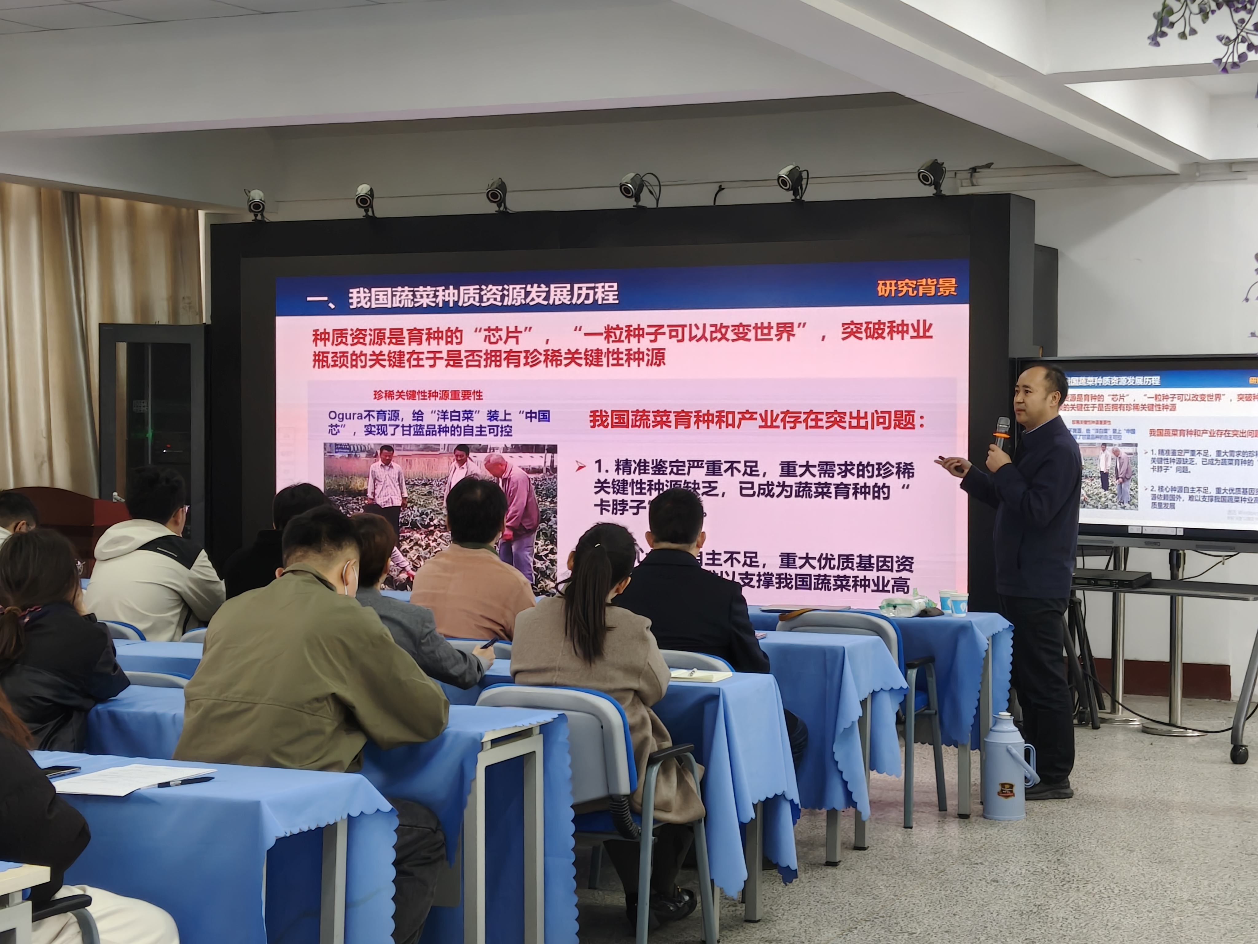 王海平从我国蔬菜种质资源发展历程入手,强调了种质资源是育种的“芯片”,突破种业瓶颈的关键在于是否拥有珍稀关键性种源,提出了要对珍稀濒危种质资源进行抢救性保护。他谈到,我国蔬菜育种和产业存在突出问题:精准鉴定严重不足,重大需求的珍稀关键性种源缺乏;核心种源自主不足,重大优质基因资源依赖国外。我国蔬菜种质资源取得的主要成就是,开辟了蔬菜等经济作物珍稀濒危种质资源的抢救性保护;建立了蔬菜种质资源精准鉴定体系;资源共享利用有力支撑了科技与产业发展。他详细讲授了种质资源创新工作及我国蔬菜种质资源工作未来发展方向,鼓励大家积极投身相关研究,为种业的进步贡献力量。