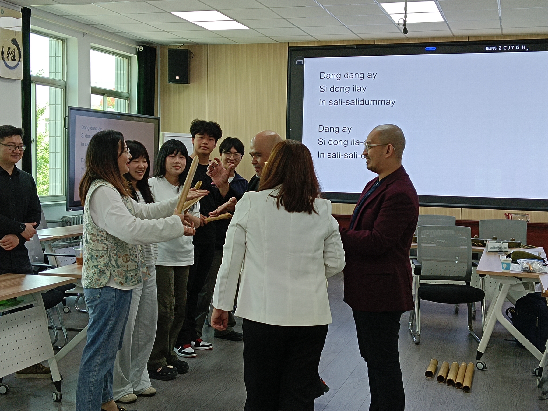 在乐器展示与传授体验环节,三位教授化身“音乐魔术师”,现场展示了库林唐(Kulintang)、巴泠兵(Balingbing)等菲律宾传统乐器的独特音色与演奏方式。这些造型各异的乐器发出的乐音,有的清脆悦耳,有的低沉浑厚,瞬间将听众带入充满异域风情的音乐世界。参与体验的同学沉浸其中,与专家积极展开互动。最后,三位专家与现场师生共同演唱了一段中菲音乐融合的旋律。当和谐美妙的音乐响起,音乐跨越国界,在交流与对话中实现了完美融合。