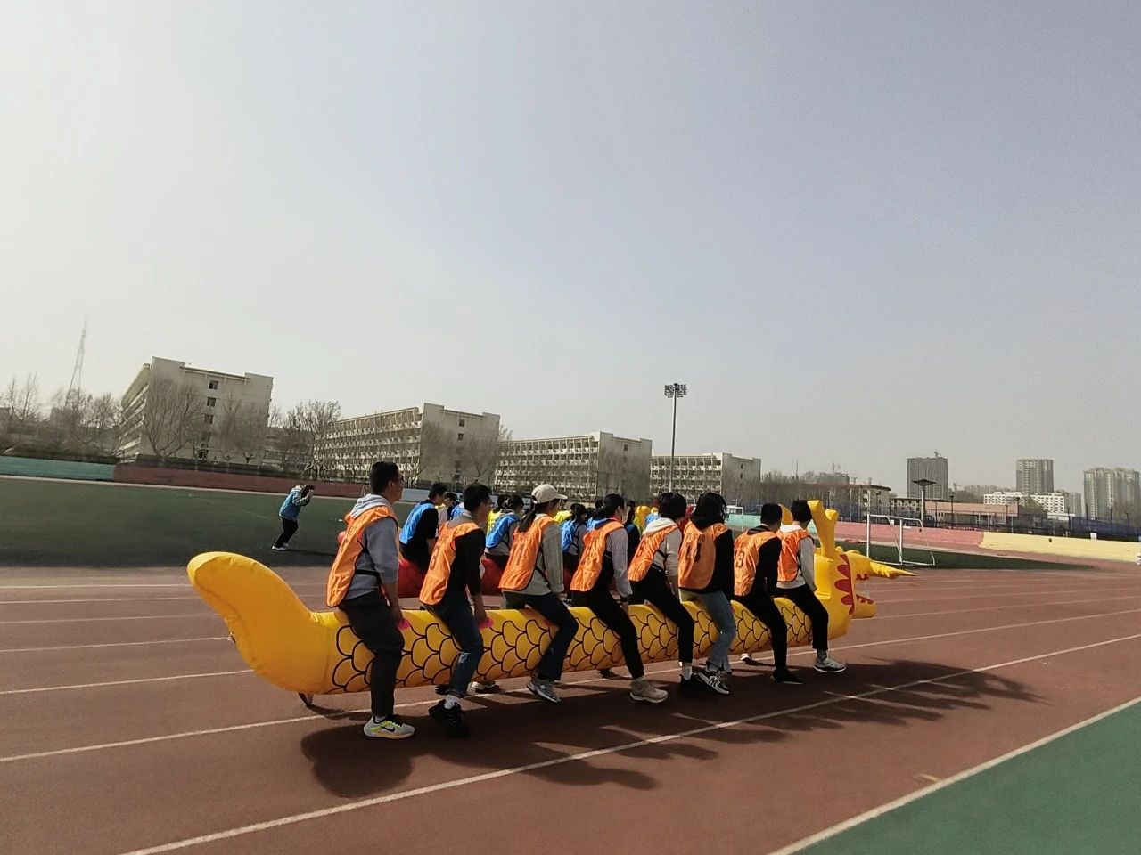 春日春风春满园,师生欢聚笑开颜。在这个春意盎然、万物复苏的美好时节,伴随着欢快的音乐,一场别开生面的师生趣味运动会正在如火如荼地进行。学院党委书记程波为开幕式致辞,他强调体育是促进人的全面发展的重要手段,是提升学生综合素质的重要工程,也是落实学院校园文化建设的实际行动。希望广大师生在运动会上赛出竞技水平,赛出个性风采,更赛出团结友谊。正式比赛前,体育学院冯琳恩同学带领大家做热身操,确保身体达到最佳竞技状态,为接下来的比赛项目做好充分准备。本次趣味运动会共设置了旱地龙舟、一圈到底、车轮滚滚、同心协力、蛟龙出海、趣味接力六个项目,每一个项目都充满了欢笑与挑战,运动场上精彩不断,欢呼声、喝彩声此起彼伏。经过一下午的激烈角逐,运动会在欢声笑语中落下帷幕。学院执行院长冀芦沙、副院长刘国运、工会主席延辉为表现优异的小组颁奖,全体师生进行合影留念,记录运动带来的欢乐时光。