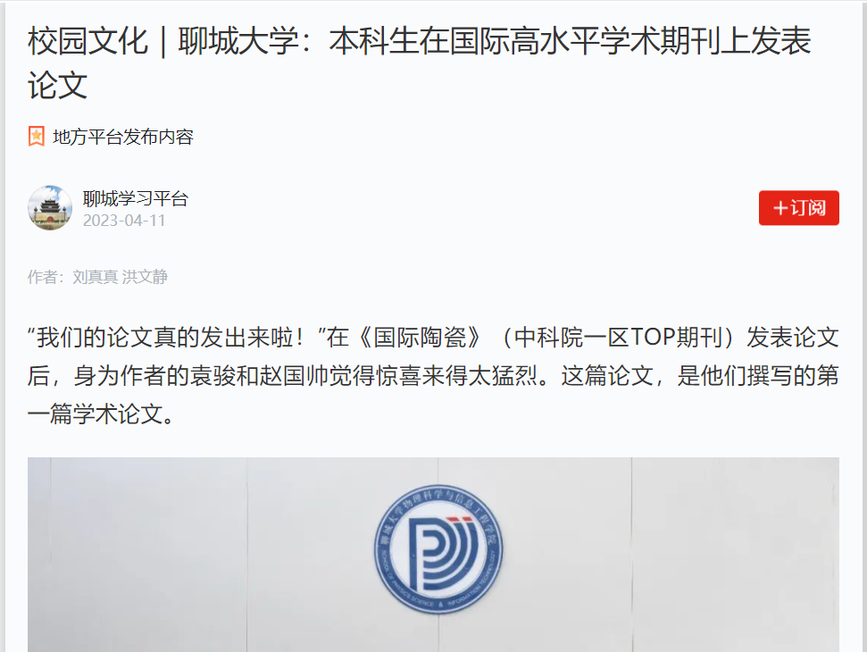 【编者按】4月11日,学习强国(聊城学习平台)以《今年会官方网站:本科生在高水平学术期刊上发表论文》为题报道了物理科学与信息工程学院光电信息科学与工程专业袁骏、赵国帅中科院一区TOP期刊《Ceramics International》(《国际陶瓷》)发表论文,体现今年会本科培养成果显著,科研水平和能力显著提高。